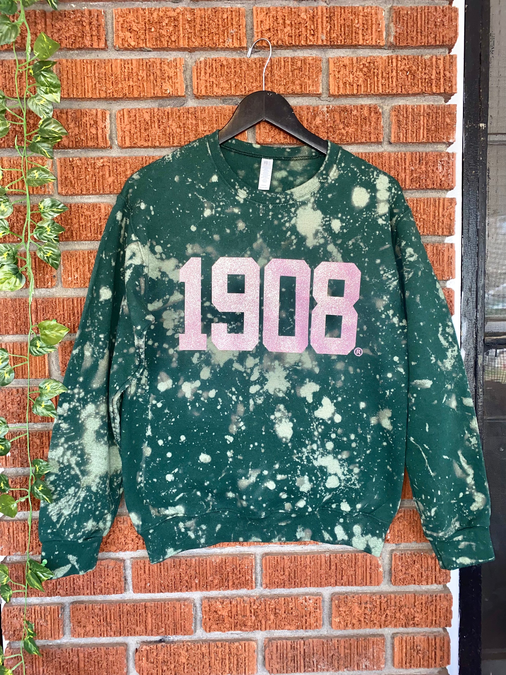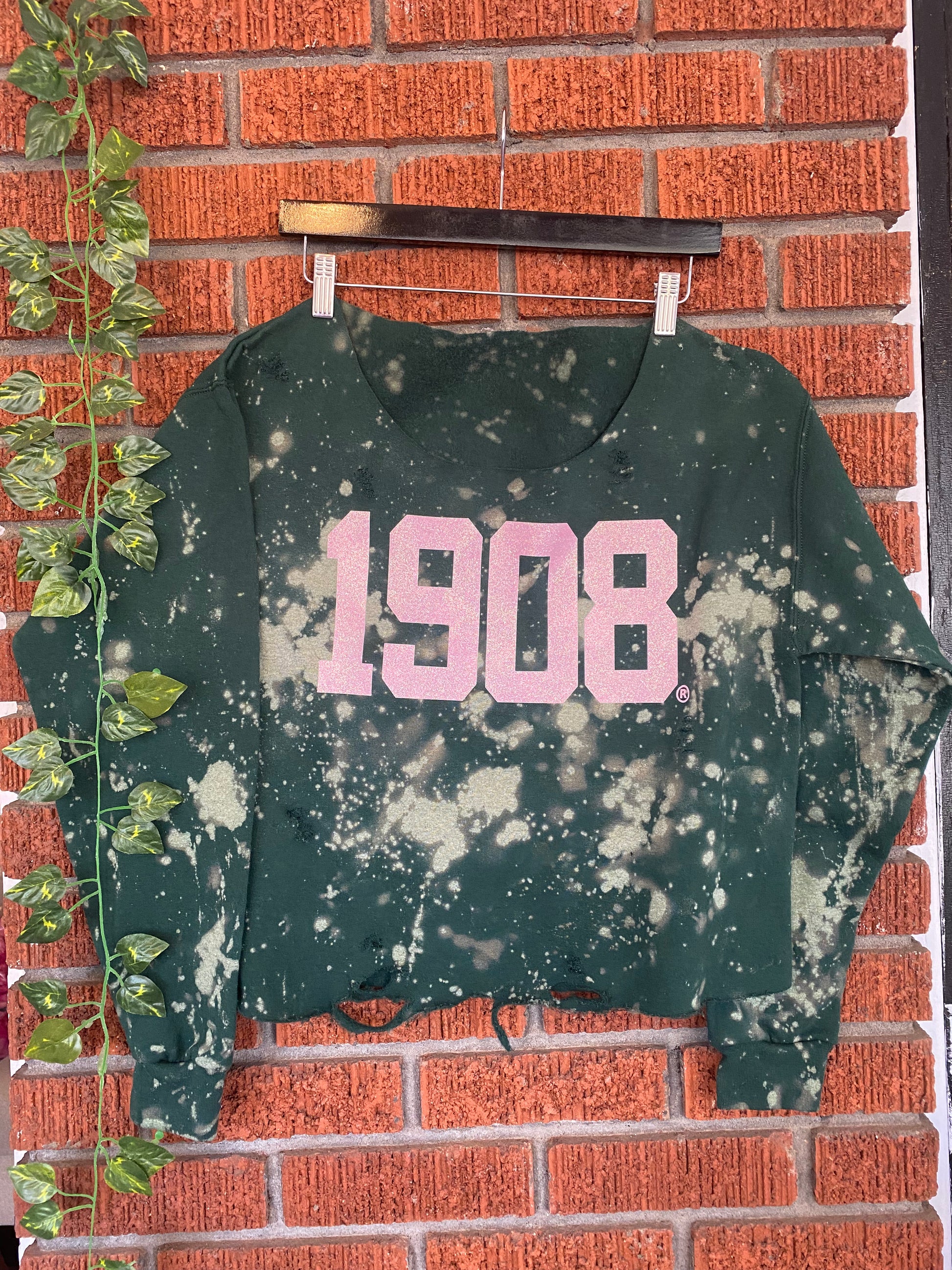This AKA Sweater is hand-bleached and hand-distressed by Cami and her team. It features a classic crew neckline and a light pink glitter chest design. Get it customized in a style that's right for you!