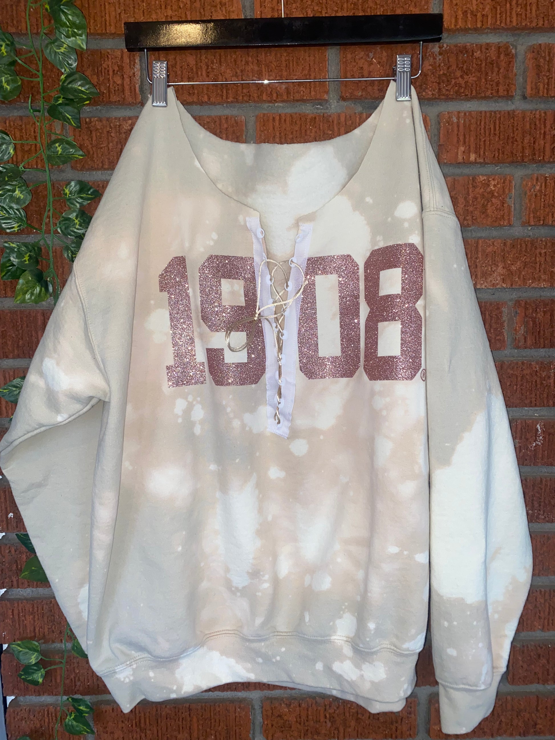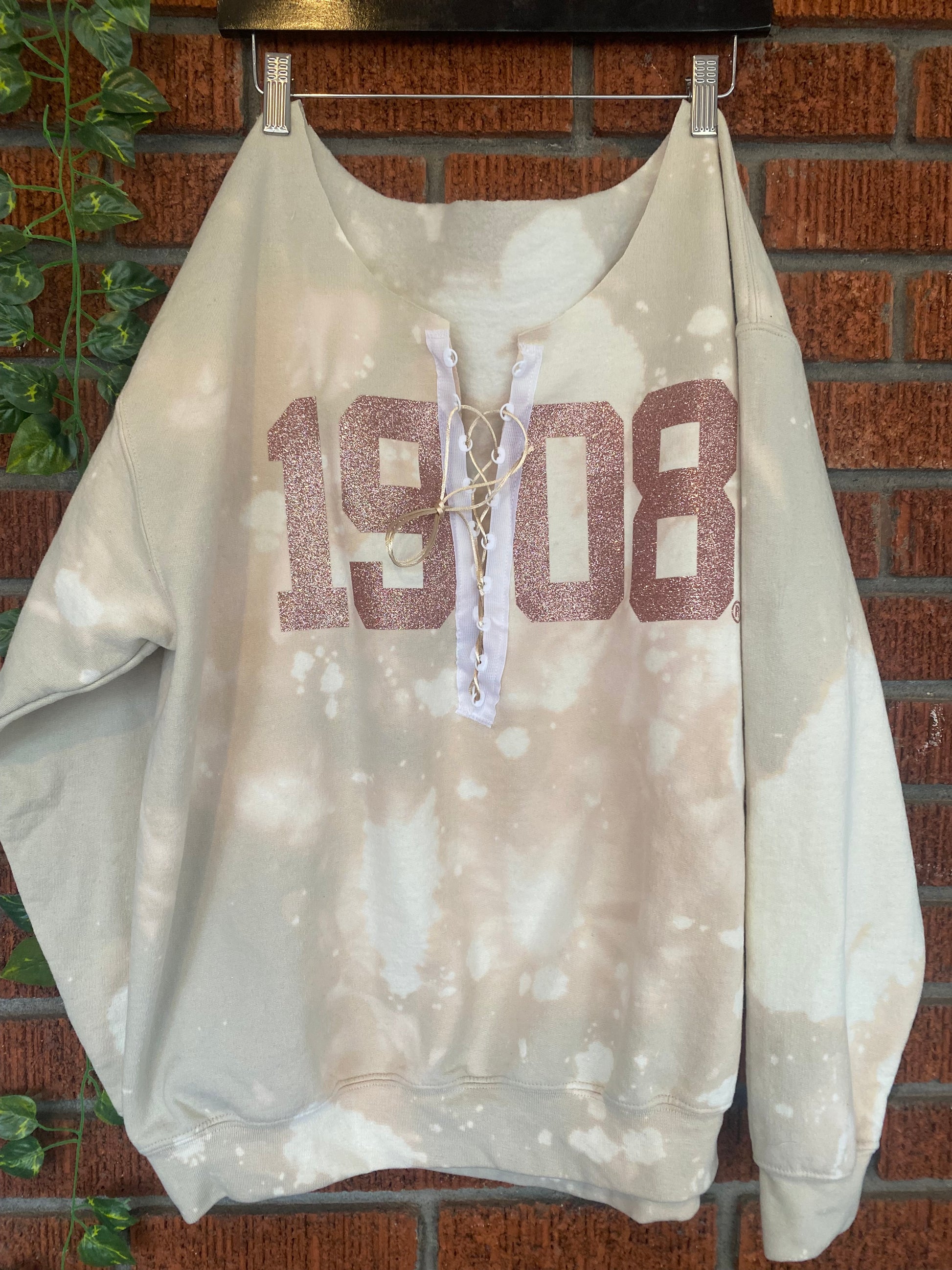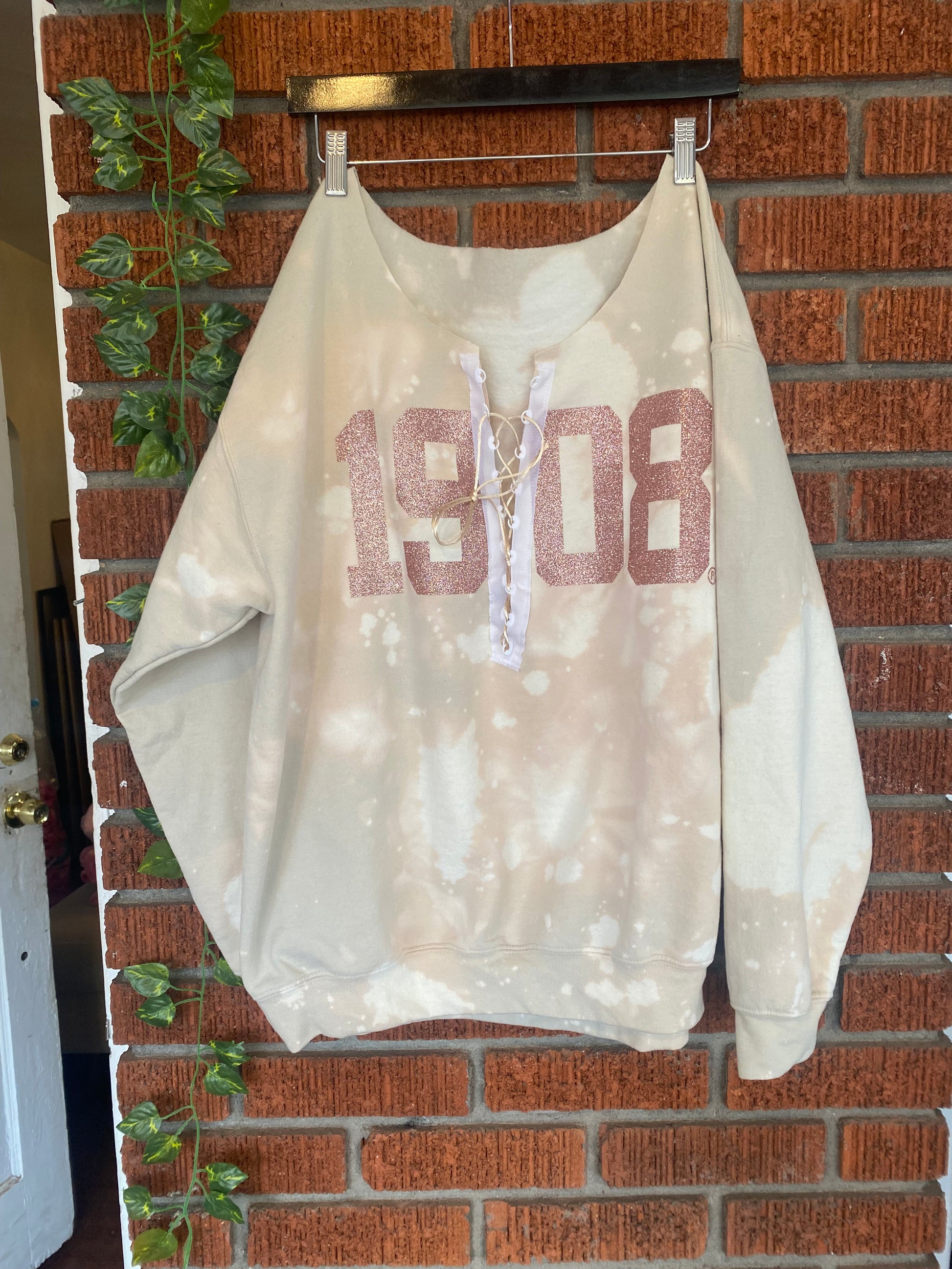 This Sweater is hand-bleached, hand sewn, and hand-distressed by Cami and her team. It features an adjustable off-shoulder neckline and a rose gold glitter chest design. Get it customized in a style that's right for you!