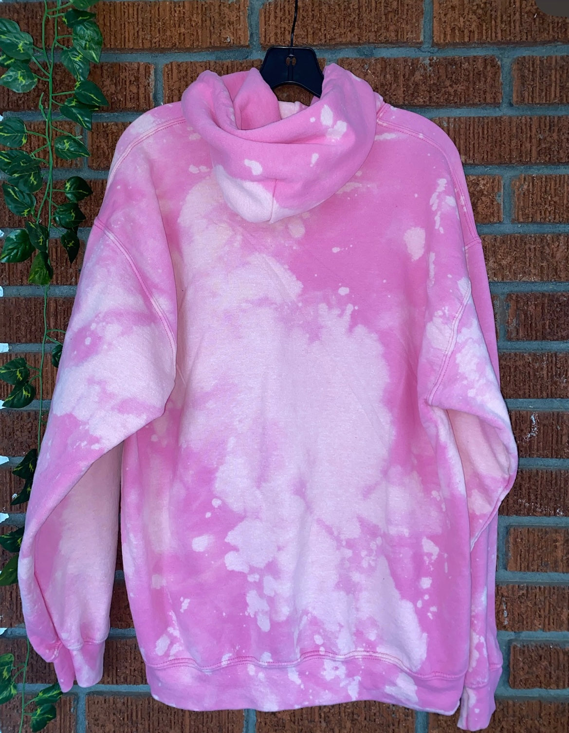This AKA hoodie is hand-bleached by Cami and her team. It features a hooded fleece, with pocket detail, and our apple glitter chest design.